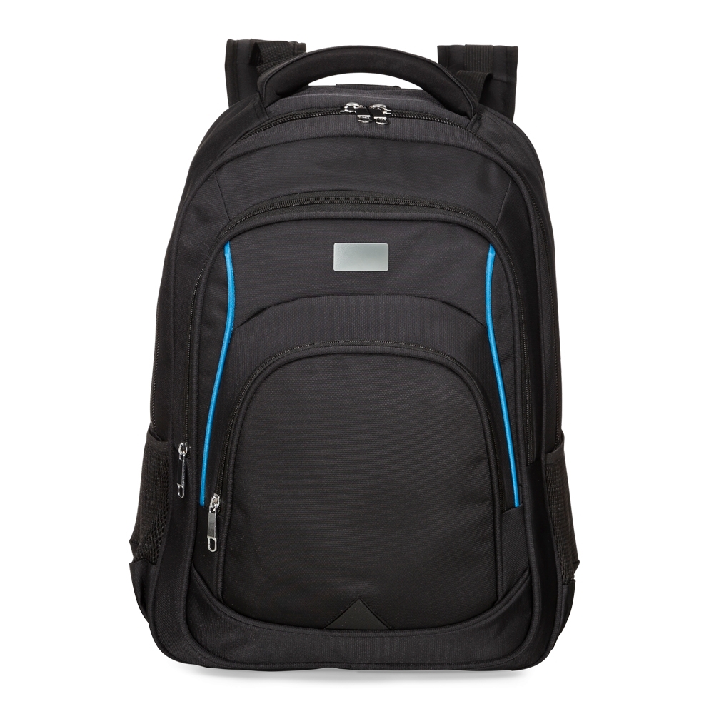 Mochila de alta confecção em poliéster com detalhes em nylon. Com amplo espaço, possui compartimento grande com bolso para notebook, compartimento mediano com divisórias para documentos, canetas, eletrônicos e entre outros; compartimento frontal e bolsos laterais em malha. Contém duas alças de mãos, sendo uma de nylon e outra com acabamento de poliéster revestido com espuma, trazendo mais eficácia no transporte de bagagens pesadas. Alças para costa com possibilidade de ajuste: superior, peitoral e inferior, porpocionando um maior conforto e correta distribuição do volume transportado. Zíperes prata, parte frontal com detalhes laterais em azul, detalhe triangular emborrachado na área frontal inferior, parte traseira com revestimento anti-transpirante e alça horizontal para encaixe em malas de viagem. Acompanha plaquinha metálica para personalização.