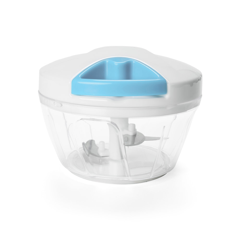 Processador de alimentos manual, tampa plástica de polipropileno branco com puxador verde, pote transparente em poliestireno com relevo e lâminas em aço inox.